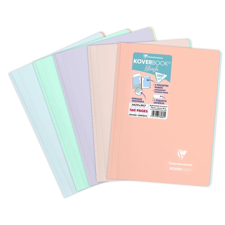 Koverbook l'original : cahier & protège-cahier, tout-en-un ! Reliure intégrale à couverture enveloppante protégeant les spirales tout en permettant une pleine ouverture du cahier à 360°. Fini les feuilles qui s'échappent ! Couverture solide et protectrice en polypropylène transparent avec deux grands rabats à pochette pour marquer les pages et ranger les documents utiles ! Papier Clairefontaine Vélin Velouté 90 g, pour une sensation de glisse unique. Certifié PEFC, pour la gestion durable des forêts. Fabriqué en France. Fourni avec une étiquette adhésive pour personnaliser le cahier (nom, prénom, matière, classe...).