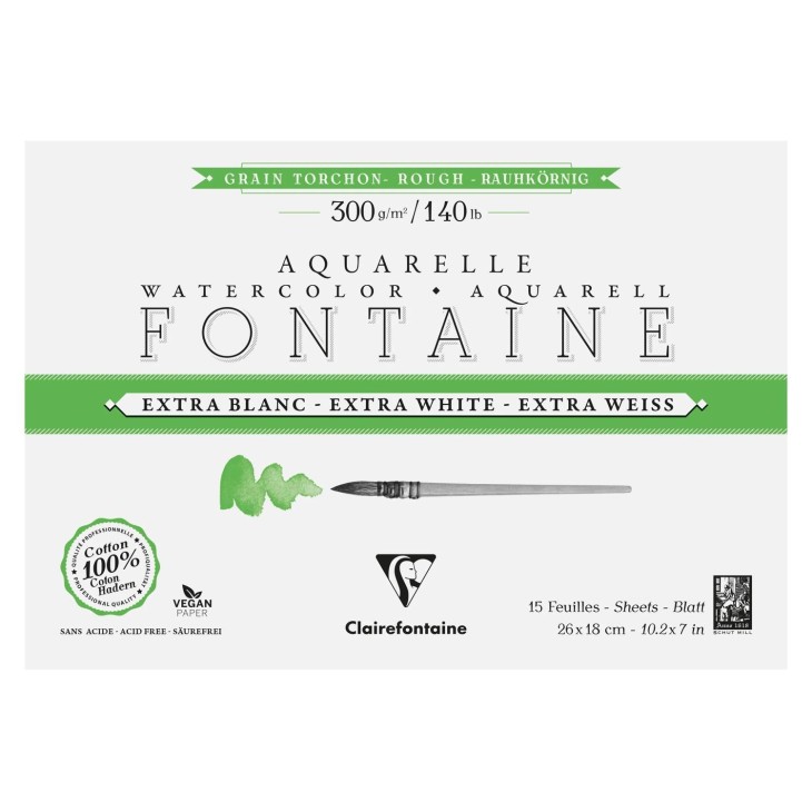 Fontaine 100% cotton Extra White watercolor paper, professional quality. Its composition, 100% pure premium cotton and its unique extra white color on the market, give it strength, stability, and pigment brightness. Its torchon grain, with its pronounced texture, is appreciated by artists for giving depth and character to a painting. Its double vegetable-based sizing, on the core and surface, makes this paper very pleasant to work with, especially in wet conditions, and helps preserve the brightness and brilliance of the pigments. Made in the pure tradition of art papers, this paper is acid-free and vegan.