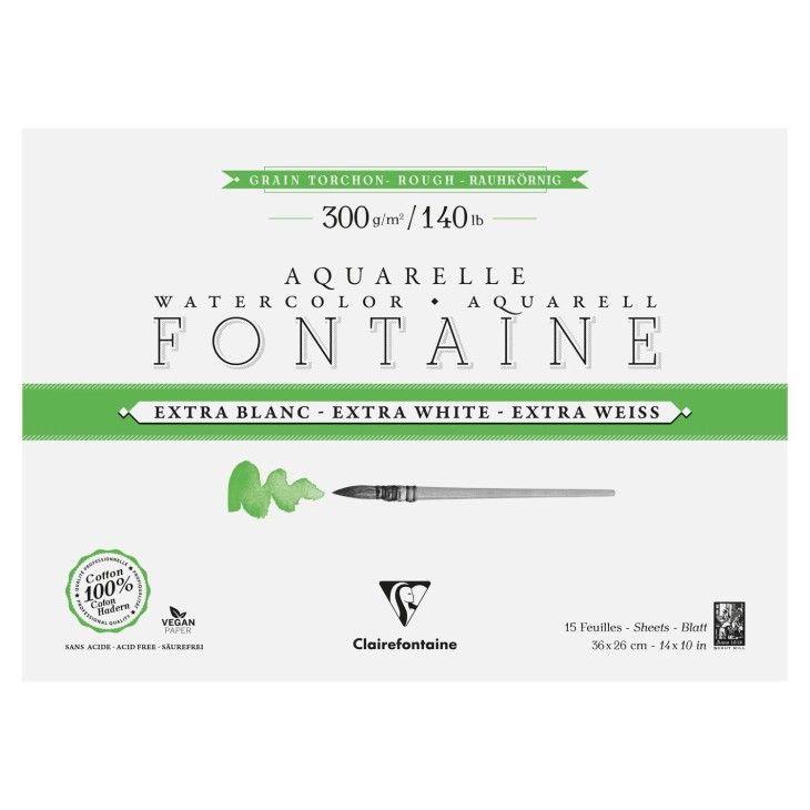 Fontaine 100% cotton Extra White watercolor paper, professional quality. Its composition, 100% pure premium cotton and its unique extra white color on the market, give it strength, stability, and pigment brightness. Its torchon grain, with its pronounced texture, is appreciated by artists for giving depth and character to a painting. Its double vegetable-based sizing, on the core and surface, makes this paper very pleasant to work with, especially in wet conditions, and helps preserve the brightness and brilliance of the pigments. Made in the pure tradition of art papers, this paper is acid-free and vegan.