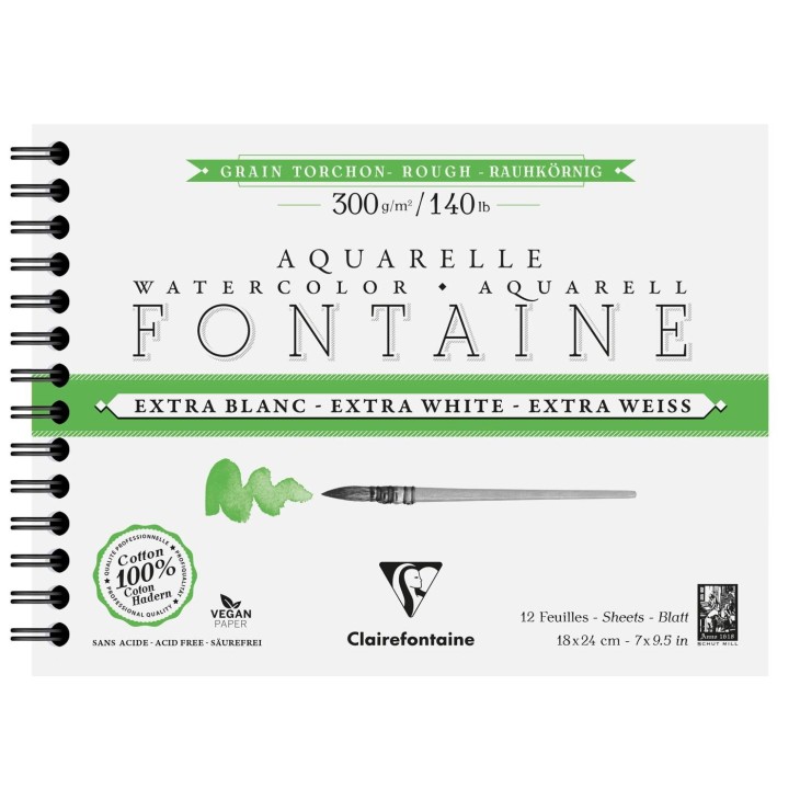 Fontaine 100% cotton Extra White watercolor paper, professional quality. Its composition, 100% pure premium cotton and its unique extra white color on the market, give it strength, stability, and pigment brightness. Its torchon grain, with its pronounced texture, is appreciated by artists for giving depth and character to a painting. Its double vegetable-based sizing, on the core and surface, makes this paper very pleasant to work with, especially in wet conditions, and helps preserve the brightness and brilliance of the pigments. Made in the pure tradition of art papers, this paper is acid-free and vegan.