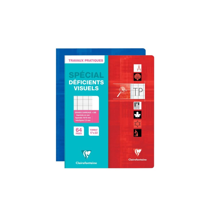 Dès 1950, Clairefontaine entreprend de proposer des cahiers tranchant par la qualité de leur papier, la gaieté et la solidité de leur couverture, sur les piètres articles de l'époque. Clairefontaine révolutionnera alors l'usage des cahiers et appuiera l'engagement de l'entreprise dans une quête permanente d'amélioration de la qualité. Désormais célèbre pour ses cahiers haut de gamme, Clairefontaine fabrique ses produits à base de papier uniquement avec des pâtes à papier provenant à 100% de forêts certifiées pour leur gestion environnementale. Grâce à des produits parfaitement en phase avec les besoins de tout à chacun, Clairefontaine fait partie intégrante de notre quotidien. Lignage spécial déficients visuels : carreaux agrandis, imprimés en noir avec les lignes primaires et la marge plus marquées que les lignes secondaires. Couverture carte pelliculée brillante et imperméable. Fabriqué en France. Papiers Clairefontaine : Vélin Velouté 90g et Dessin extra blanc 125g. Certifié PEFC, pour la gestion durable des forêts.