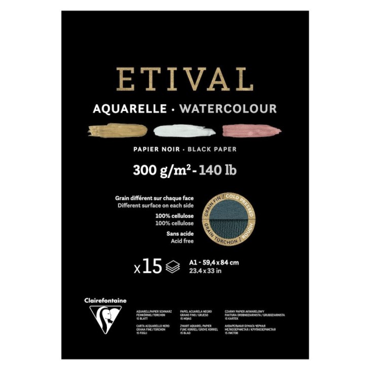 Papier aquarelle Etival 100% cellulose, de qualité étude. Sa teinte noire profonde et son double grain (fin au recto et torchon au verso) offrent de belles alternatives aux aquarellistes. Une surface subtile au recto pour une technique facilitée et une surface unique au verso. Sans acide, de pH neutre excellente conservation et bonne capacité d'absorption. Bien adapté aux débutants ou aux utilisateurs occasionnels.