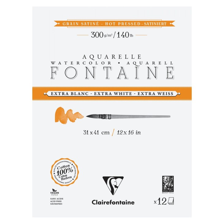 Papier aquarelle Fontaine 100% coton Extra Blanc, de qualité professionnelle. Sa composition, 100% pur coton premium et sa teinte extra blanche unique sur le marché, lui confèrent résistance, stabilité et luminosité des pigments. Son grain satiné, pressé à chaud et parfaitement lisse, est adapté aux aquarelles de précision et aux œuvres détaillées. Son double-encollage végétal, au cœur et en surface, rend ce papier très agréable à travailler, en particulier dans l'humide et permet de préserver l'éclat et la brillance des pigments. Fabriqué dans la pure tradition des papiers d'art, ce papier est sans acide et vegan.
