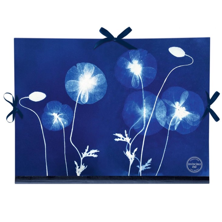 Cyanotype, Drawing board 28x38cm, closure with 3 ribbons Invincible summer pays homage to the work of Anna Atkins, a 19th-century English botanist, the first to use the cyanotype technique to create herbariums accurately reflecting all the magical details of nature. Discover the Cyanotype office universe designed to accompany you elegantly in every moment of your daily life. Each accessory is designed to combine functionality and style to embellish your workspace and facilitate your organization. 1 visual. Grained paper for a sober, raw and natural finish.